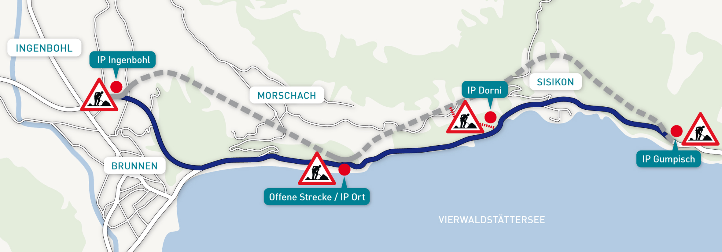 - Insgesamt reicht die Strecke A4 Neue Axenstrasse vom Anschluss Ingenbohl im Norden bis zur Galerie Gumpisch im Süden.